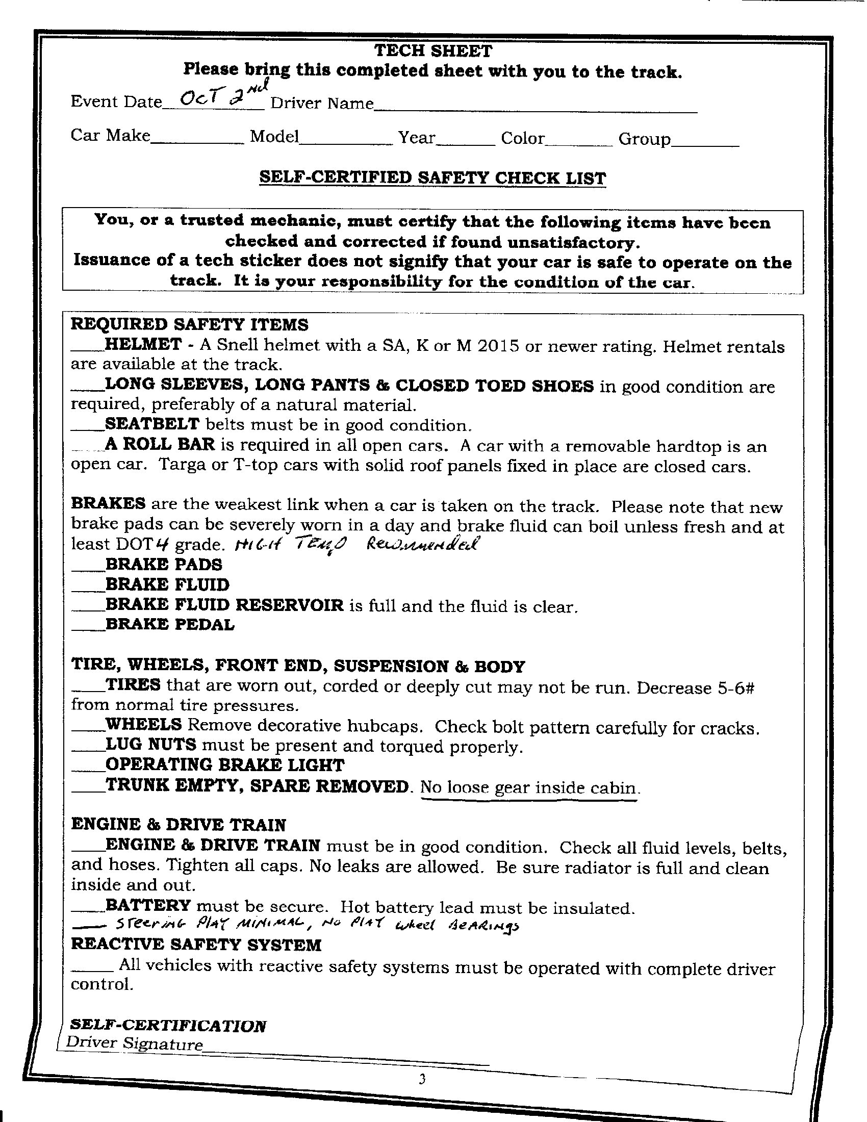 Tech and Helmet inspections will take place at track Weds morning from (6AM – 7:30AM), or pre-tech online.